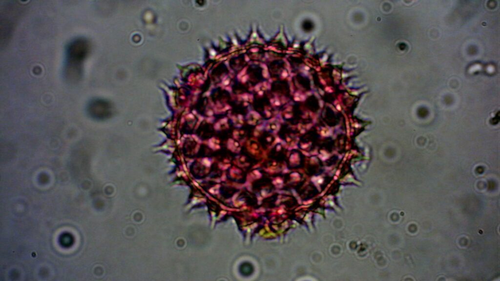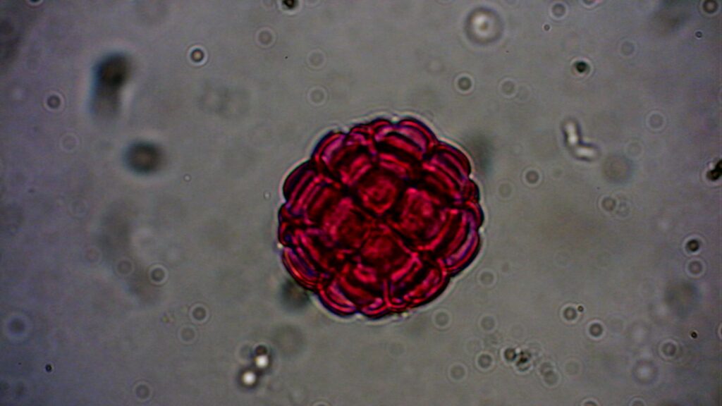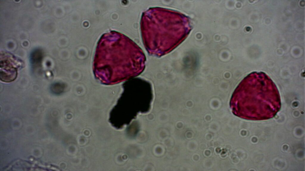 Pollentelling = klasse bepaling. Pollenanalyse van de onderzocht honing geeft een globaal beeld van de meest voorkomende pollen in de honing. De pollen worden volgens de imkermethode bepaald. Benoeming van pollen is een tijdrovend en moeilijk werk, maar geeft een imposante inkijk in de miniwereld en laat zien dat de natuur het mooist is in het kleine! De telling bepaalt hier het aantal pollen per 10 gram honing en daarmee de klasse van de geteste honing. Pollen bepaling kan op speciaal verzoek wel worden bepaald in overleg, maar maakt geen deel van van dit onderzoek, |