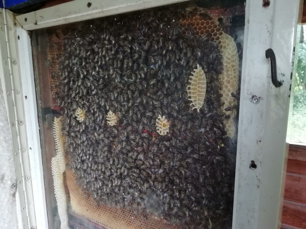 In de observatie kast kan men de bijtjes hun werk zien doen, het broed bekijken, de koningin opzoeken en meestal zie je wel bijtjes die de bijendans uitvoeren -geen onzinnige Tik-Tok dansjes, maar zij geven aan elkaar door waar nectar of pollen zijn te vinden in overvloed.