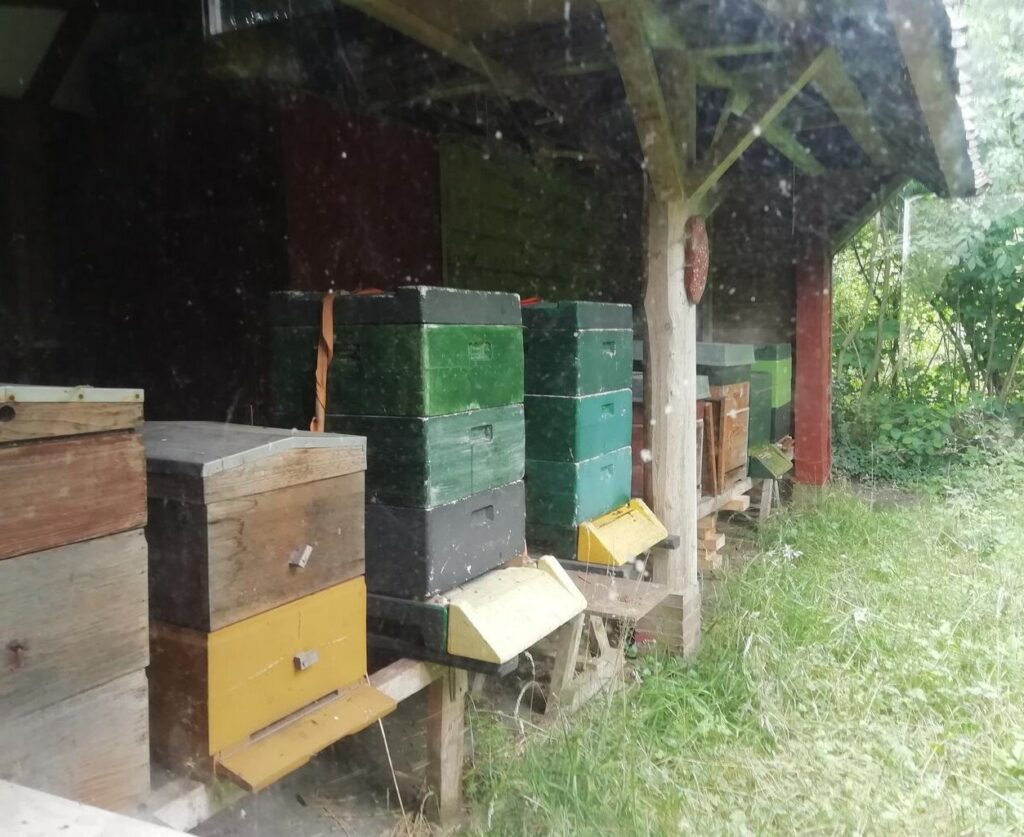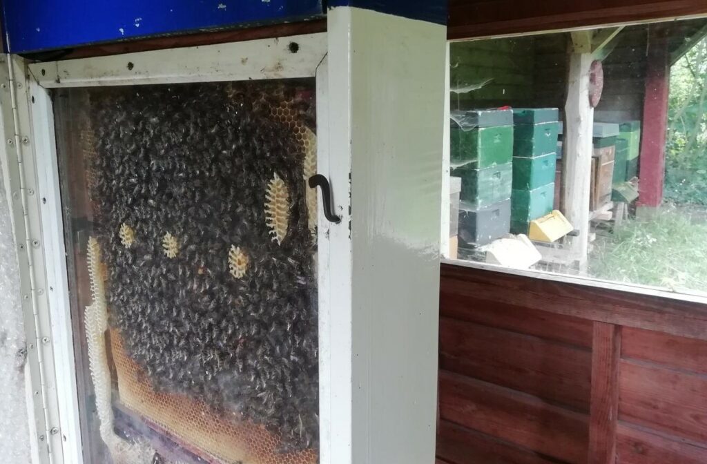 Via het raam heeft men een mooie veilige uitkijk op de in de stal staande bijenkasten van enkele imkerleden. Die kunnen wisselen want soms gaan de volken op reis, bijvoorbeeld naar het koolzaad in het voorjaar, het fruit, de bes of de linde. Voor de heidedracht hoeven ze dan weer niet zo ver te vliegen.