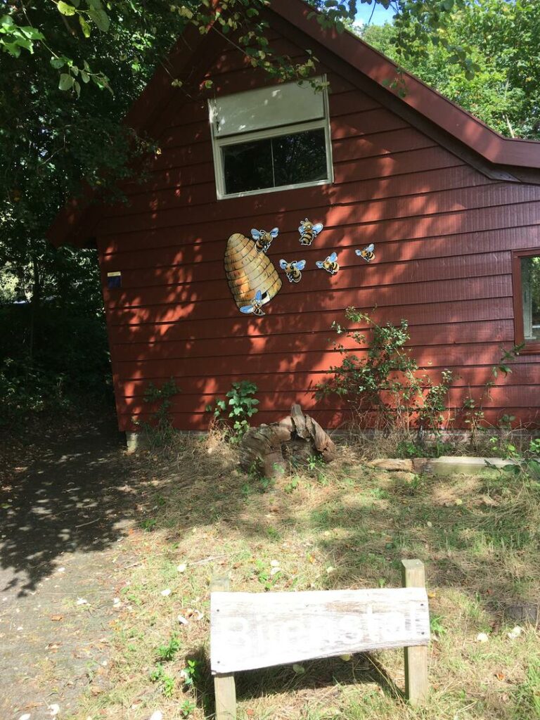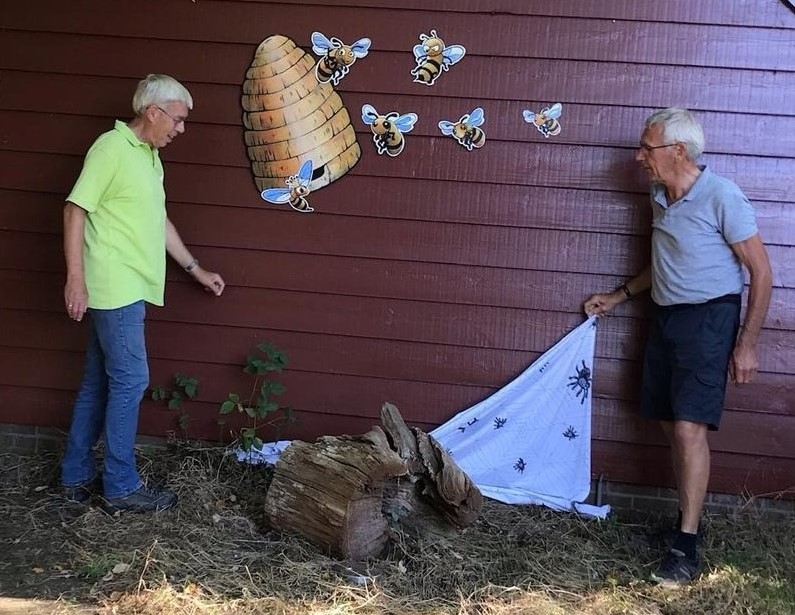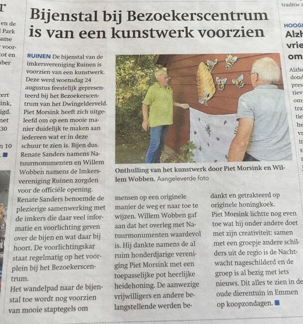 Woensdag 24 augustus 2022 is er een mooie “Bijenkorf” op de gevel van de bijenstal naast het Bezoekerscentrum onthuld. Willem Wobben onze voorzitter, en Piet Morsink- de ontwerper- onthulden deze vrolijkebijtjes, waar uitsluitend Natuurmonumentenmensen bij aanwezig waren. Maar die partij heeft dit dan ook geschonken waardoor de stal van verdere afstand voor het publiek ook beter zichtbaar is.