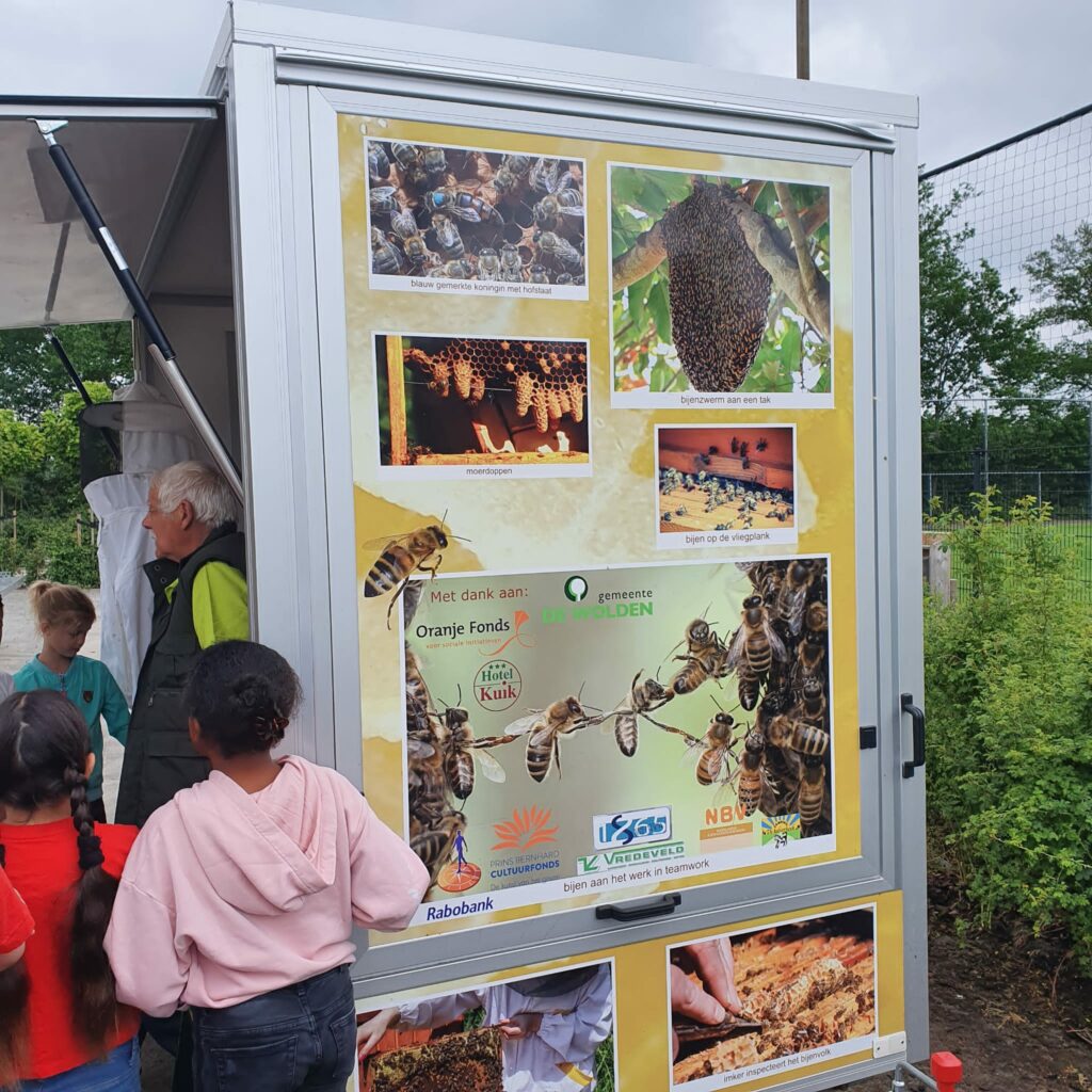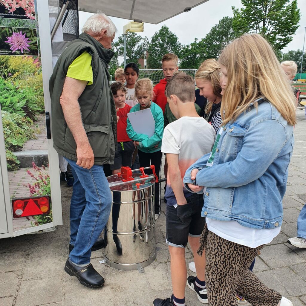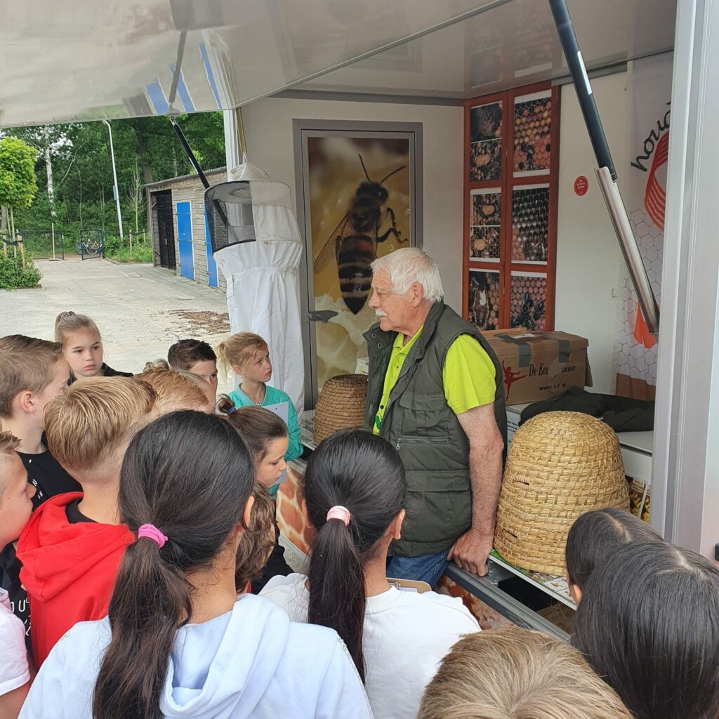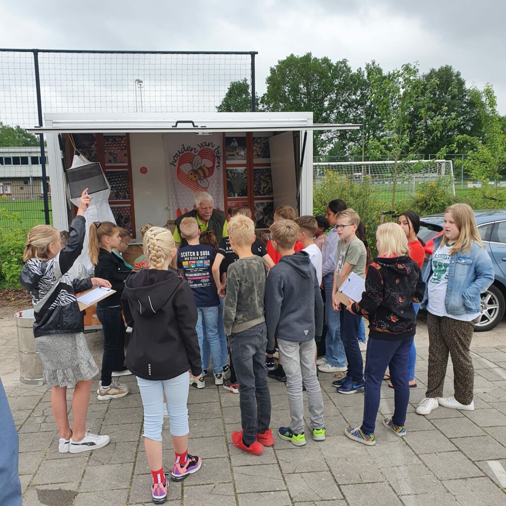 Onlangs brachten wij als imkervereniging een bezoekje op OBS de Dissel te Ruinerwold. We namen onze informatiewagen mee die we openstelde voor de kinderen. Onze leden Eizo Eizinga en Jan Willem Benning mochten de kinderen van alles over de bloemetjes en de bijtjes vertellen. En dat werd met veel aandacht gevolgd. De school had een bijenweek georganiseerd voor de groepen 3 – 8 .